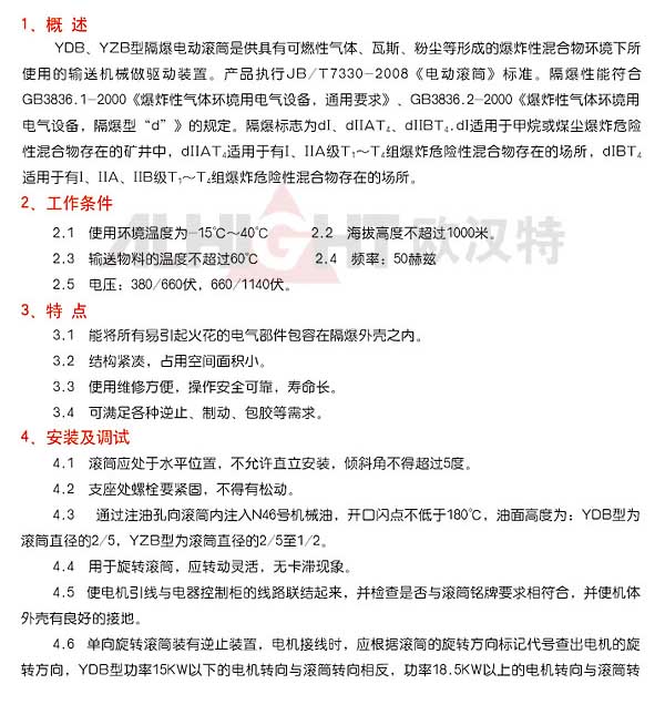 該產(chǎn)品是供具有可燃性氣體、瓦斯、粉塵等形成的爆炸性混合物環(huán)境下帶式輸送機(jī)所使用的驅(qū)動(dòng)裝置。產(chǎn)品嚴(yán)格執(zhí)行JB/T7330-08《電動(dòng)滾筒》標(biāo)準(zhǔn)。隔爆性能符合GB3836.1-2000《爆炸性氣體環(huán)境用電氣設(shè)備、通用要求》、GB3836.2-2000《爆炸氣體環(huán)境用電氣設(shè)備,隔爆型"d"》的規(guī)定。隔爆標(biāo)志為dl、dllAT4、DllBT4。dl適合于所有甲烷或煤塵爆炸危險(xiǎn)性混合物存在的礦井中。