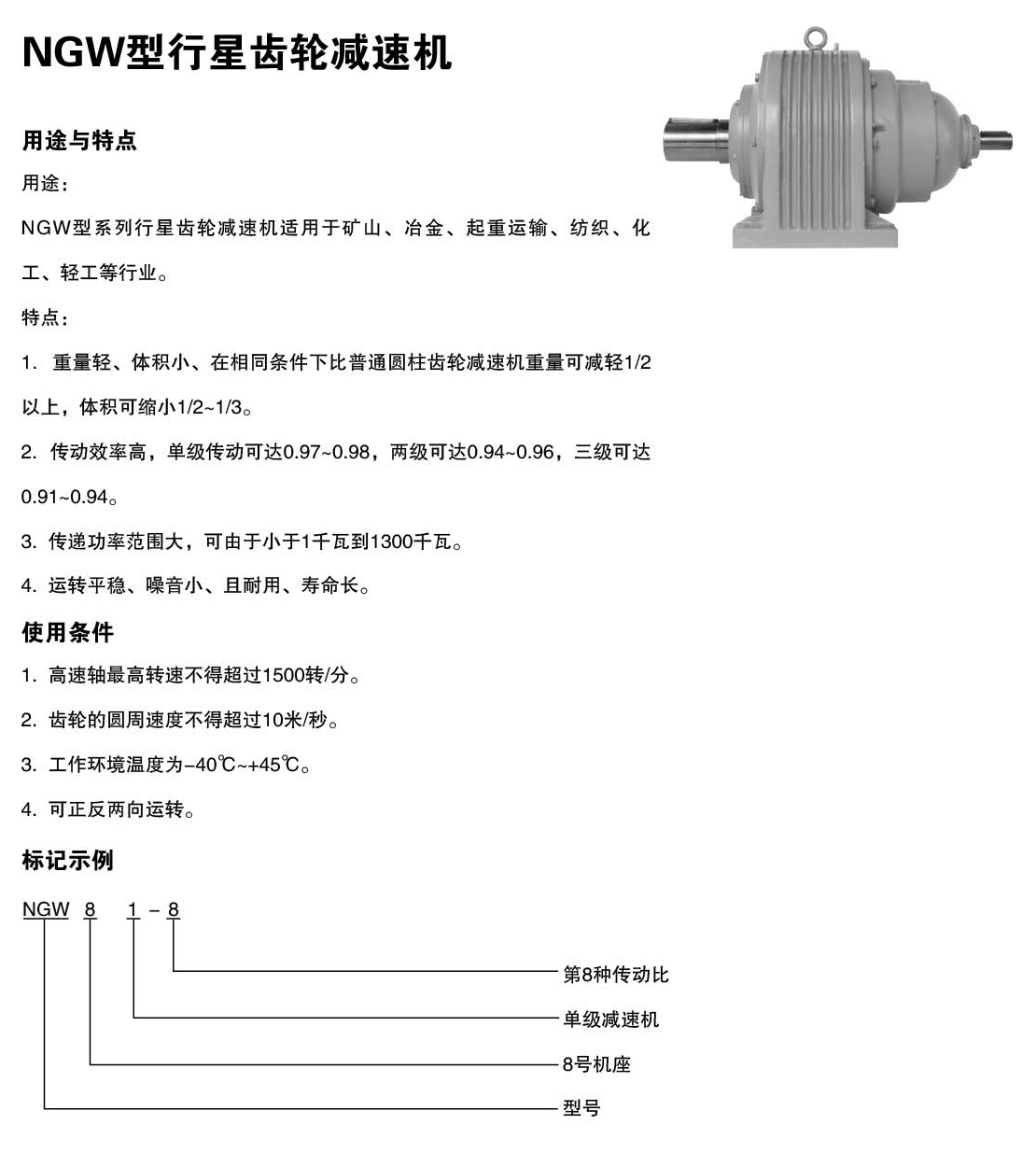 NGW型系列行星齒輪減速機適用于礦山、冶金、起重運輸、紡織、化工、輕工等行業(yè)。